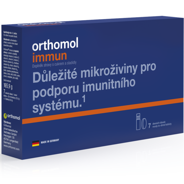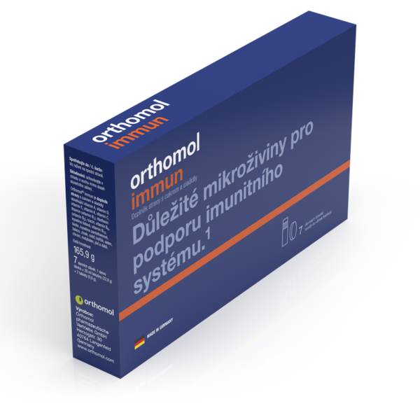 Orthomol Immun je doplněk stravy s cukrem a sladidly obsahující vitamin A, vitamin D, vitamin E, vitamin K, vitamin C, thiamin (vitamin B1), riboflavin(vitamin B2), niacin, vitamin B6, kyselina listová, vitamin B12, biotin, kyselina pantothenová, železo, zinek, měď, hořčík, selen, chrom, molybden, jód a další.
